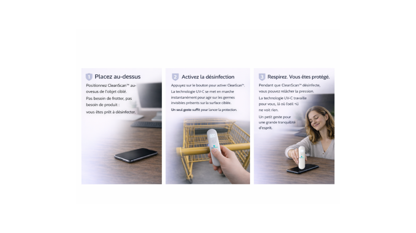 Sans produits toxiques ni résidus, CleanScan offre une désinfection efficace et sécuritaire, idéale pour une utilisation quotidienne.